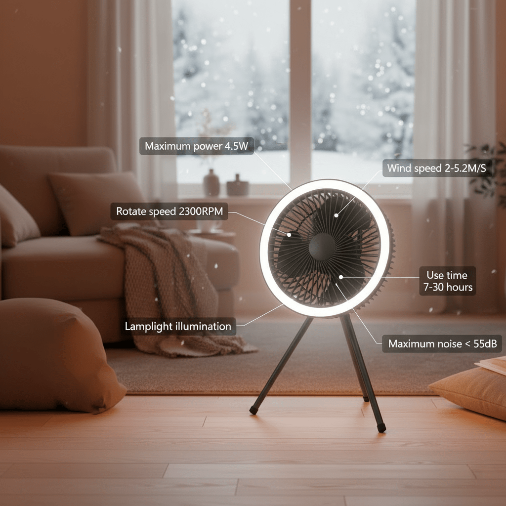 The H12 Triangle Bracket LED Camping Fan is a versatile outdoor companion that combines powerful airflow with ambient lighting. Featuring a durable aluminum alloy and ABS plastic body, this portable fan is ideal for camping, picnics, or indoor use. Its 7-inch, 6-blade design spins at 2300 RPM, delivering adjustable wind speeds from 2–5.2 m/s for cooling comfort in any setting.