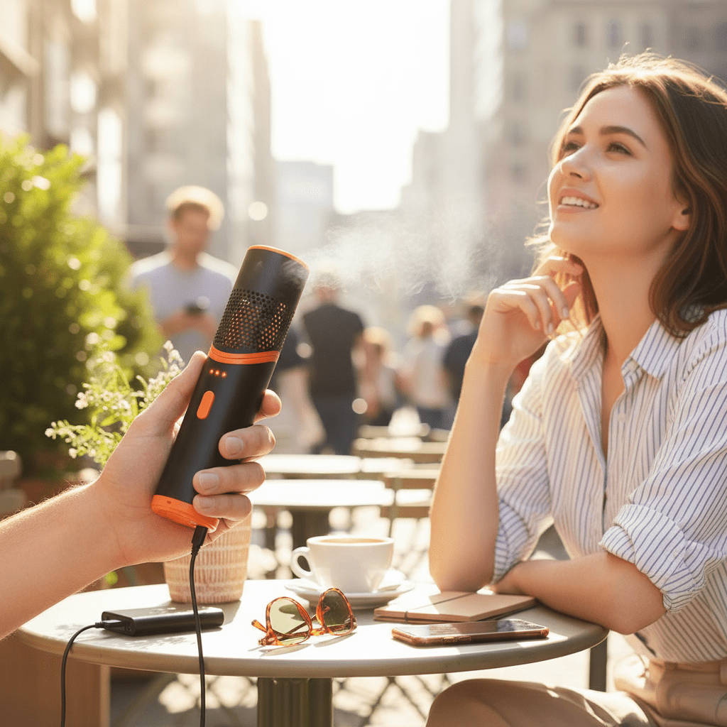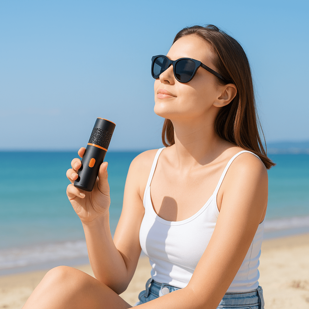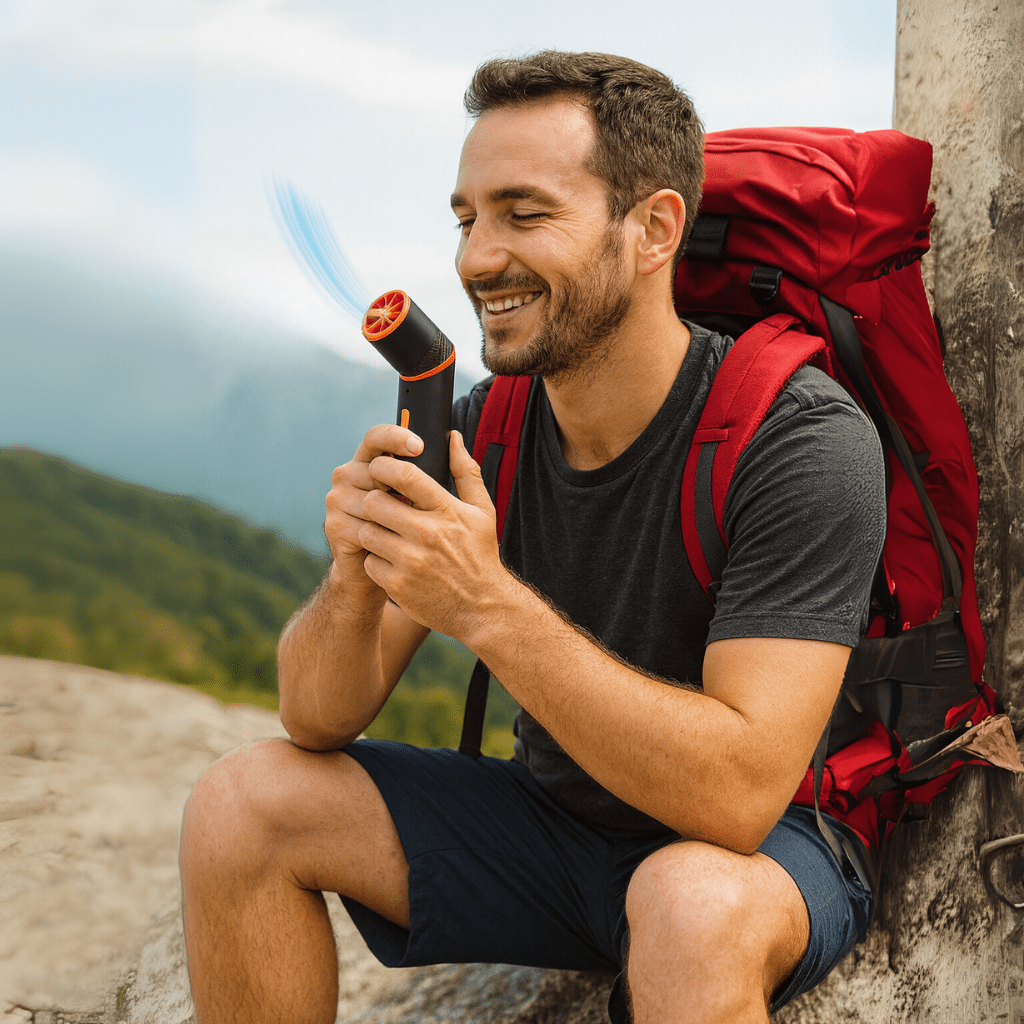 Charging is fast and convenient via a USB-C with a full recharge time of just 3–5 hours. A level indicator displays battery status at a glance. The fan’s metal and electronic component construction ensures durability and a premium feel, while its lightweight body—only 175 g and measuring 156 × 38 mm—fits easily in a bag or pocket.