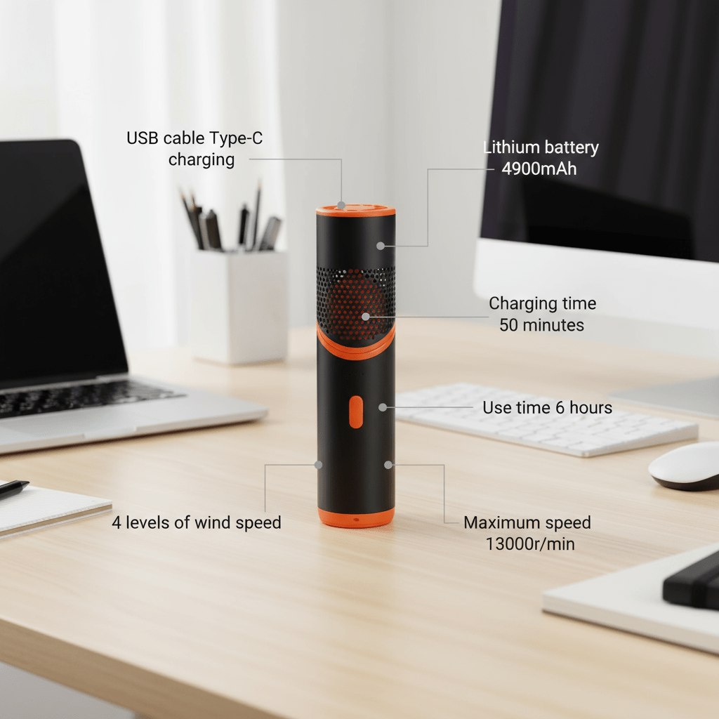 Powered by a durable 3.6 V 4900 mAh lithium battery, the SD-01 provides 6–20 hours of cooling on a full charge. The high-efficiency brushless motor spins the fan blades at 15,000 or 18,000 RPM, generating wind speeds of 4–6 m/s while keeping noise below 65 dB for quiet comfort.