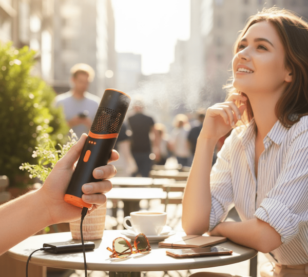 Charging is fast and convenient via a USB-C with a full recharge time of just 3–5 hours. A level indicator displays battery status at a glance. The fan’s metal and electronic component construction ensures durability and a premium feel, while its lightweight body—only 175 g and measuring 156 × 38 mm—fits easily in a bag or pocket.